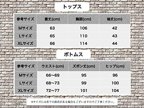 【サイズ】 トップス: <Mサイズ> 着丈 63cm,胸囲 106cm,袖丈 42cm <Lサイズ> 着丈 65cm,胸囲 110cm,袖丈 43cm <XLサイズ> 着丈 66cm,胸囲 114cm,袖丈 44cm ボトムス: <Mサイズ> ウエスト 66~69cm,ズボン丈 95cm,ヒップ 96cm <Lサイズ> ウエスト 68~73cm,ズボン丈 99cm,ヒップ 100cm <XLサイズ>ウエスト 72~77cm,ズボン丈 101cm,ヒップ 104cm ※サイズには若干の誤差がある場合もございますのでご了承ください。