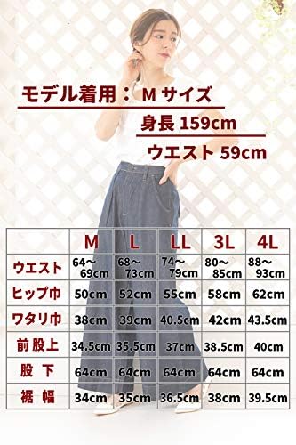 [Mサイズ]ウエスト:64~69cm、ヒップ巾:50cm、ワタリ巾:38cm、前股上:34.5cm、股下:64cm、裾巾:34cm [Lサイズ]ウエスト:68~73cm、ヒップ巾:52cm、ワタリ巾:39cm、前股上:35.5cm、股下:64cm、裾巾:35cm [LLサイズ]ウエスト:74~79cm、ヒップ巾:55cm、ワタリ巾:40.5cm、前股上:37cm、股下:64cm、裾巾:36.5cm [3Lサイズ]ウエスト:80~85cm、ヒップ巾:58cm、ワタリ巾:42cm、前股上:38.5cm、股下:64cm、裾巾:38cm [4Lサイズ]ウエスト:88~93cm、ヒップ巾:62cm、ワタリ巾:43.5cm、前股上:40cm、股下:64cm、裾巾:39.5cm
