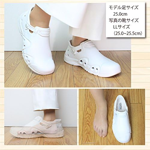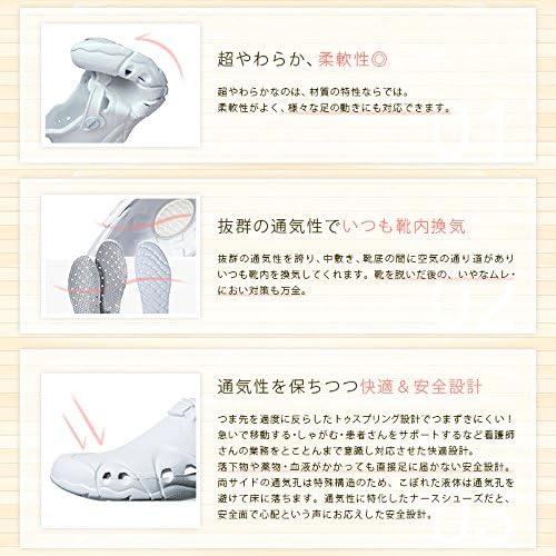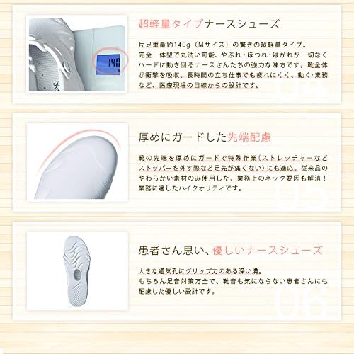 片足重量約140g(Mサイズ)の驚きの超軽量タイプのナースシューズ。完全一体型で丸洗い可能、やぶれ、ほつれ、はがれが一切なくハードに動き回るナースさんたちの強力な味方です。靴全体が衝撃を吸収、長時間の立ち仕事でも疲れにく、医療現場からの目線から作られたハイスペックなナース用シューズ。