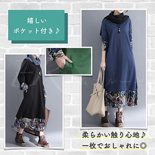 a ライン 長そで 膝丈 ひざたけ オフィス カジュアル スクール 用 10 20 30 40 50 60 代 大人のワンピース ネイビー フラワー 花柄 森ガール 重ね着風 ロング丈 膝丈 花 柄