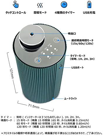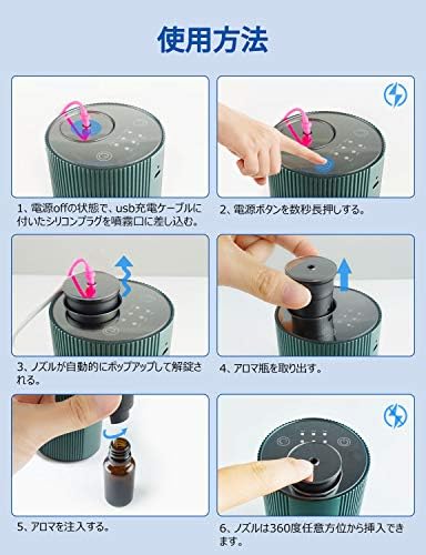【便利な充電式・多様な稼働モード】充電式コードレスですので、フル充電で6時間連続稼働可能です。3種類の稼働モード・4種類のタイマーモードで12種類の設定が可能です。多様な稼働モードで香りの強さを調節することでご生活にありとあらゆる場面も対応可能です。ご説明:15秒モード(噴霧15秒間隔165秒 、オイル消耗量0.15ml/h)、 60秒モード(噴霧60秒間隔120秒、オイル消耗量0.60ml/h)、120秒モード(噴霧120秒間隔60秒、オイル消耗量1.2ml/h)。オイルの消耗量は目安となります。