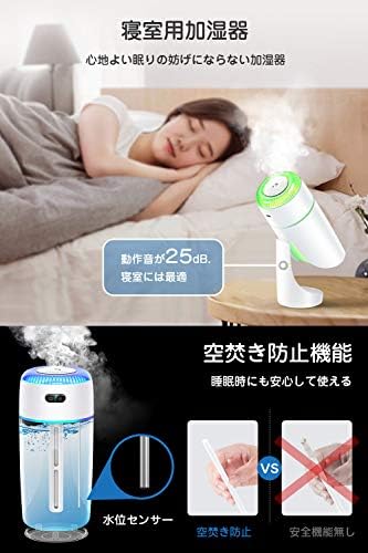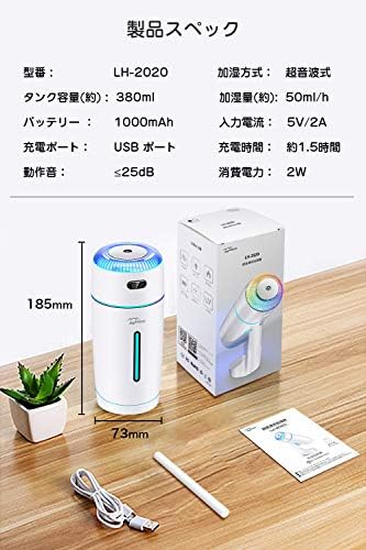 使用時間:1.5時間充電し約3時間連続使用できます。(ledライトが使用しない場合) / 満タン(380ML)場合、約12時間加湿できます。