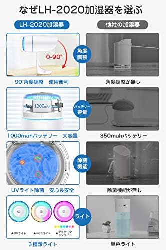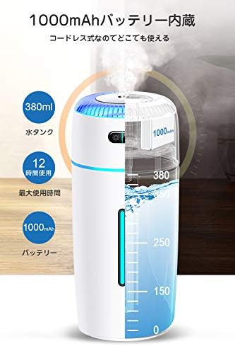 (USB充電式 加湿器 空焚き防止)1000mAhバッテリー内蔵内蔵なので、フル充電した後コードレスで使用できます。オフィスで、旅行先で、どこにいても快適空間ををお作りいただけます。空焚き防止機能付きなので、水不足の時、自動的に運転停止になるので、就寝やお出かけ時に消し忘れても心配なく使用できます。