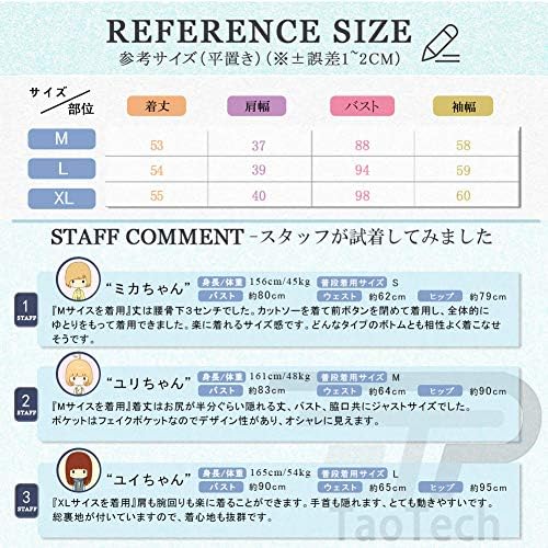 Product Specifications: Washable material. Size: S, M, L, XL. *Slim design. We recommend ordering one size larger for those who want extra room. Lining: Yes (fully lined); Shoulder pads: yes; Button: Yes (open front, self-fabric decoration); Pockets: None (fake pocket); Accessories: One button; Color options: 5 colors (white/black/light blue/blue/pink); *Note: When the product arrives, there may be some wrinkles when the product arrives, so it will be wrinkled after washing it first time. TaoTech is a registered trademark. 【Number 2016-008759】※
